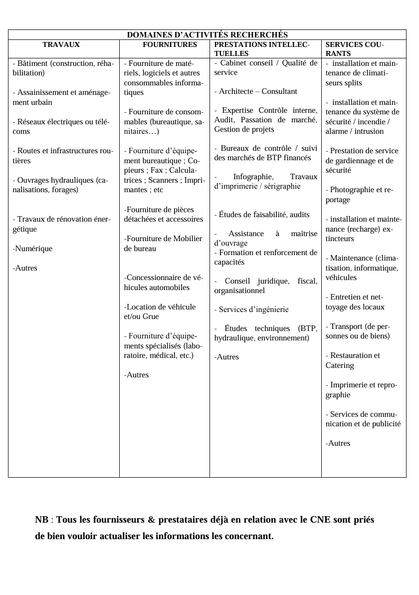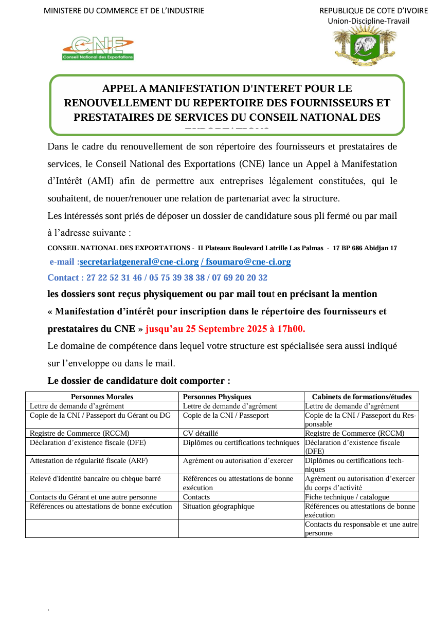 Dans le cadre du renouvellement de son répertoire des fournisseurs et prestataires de services, Conseil National des Exportations lance un appel à manifestation d’intérêt afin de permettre aux opérateurs économiques légalement constitués, qui le souhaitent, à nouer une relation de partenariat avec la structure. Les opérateurs économiques intéressés sont priés d’introduire un dossier de candidature